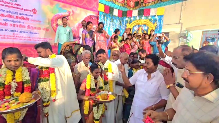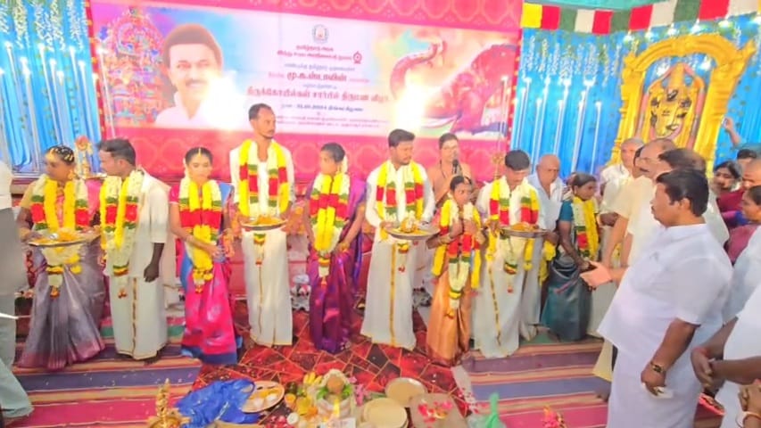 தஞ்சாவூர் மாவட்டம் கும்பகோணம் அருகே திருநாகேஸ்வரத்தில் உள்ள உப்பிலியப்பன் வெங்கடாஜலபதி கோவிலில் தமிழ்நாடு முதலமைச்சர் வழிகாட்டுதலின்படி இந்து அறநிலையத்துறை மற்றும் மயிலாடுதுறை இணை ஆணையர் மண்டலம் சார்பாக 6 இணையர் ஜோடிகளுக்கு கும்பகோணம் சட்டமன்ற உறுப்பினர் சாக்கோட்டை அன்பழகன் திருமணம் செய்து வைத்து 60,000 மதிப்பிலான சீர்வரிசையை வழங்கினார்.