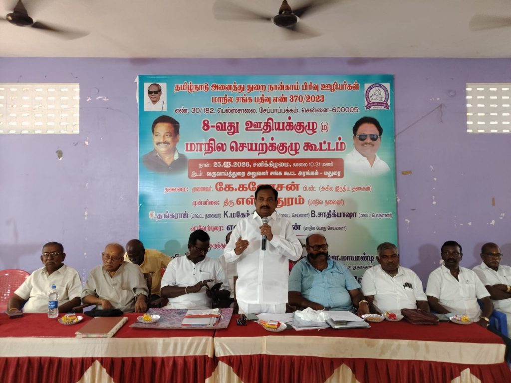 மதுரையில் மாவட்ட வருவாய்த்துறை ஊழியர் சங்க கூட்ட அரங்கில் தமிழ்நாடு அரசு அலுவலக உதவியாளர்கள் மற்றும் அடிப்படைப் பணியாளர்கள் மாநில மத்திய சங்கத்துடன் இணைந்த அகில இந்திய மாநில அரசு நான்காம் பிரிவு ஊழியர்கள் மற்றும் ஓய்வூதியர்கள் சம்மேளன மாநில செயற்குழு கூட்டம் அகில இந்திய தலைவர் முனைவர் கணேசன் தலைமையில் நடைபெற்றது.