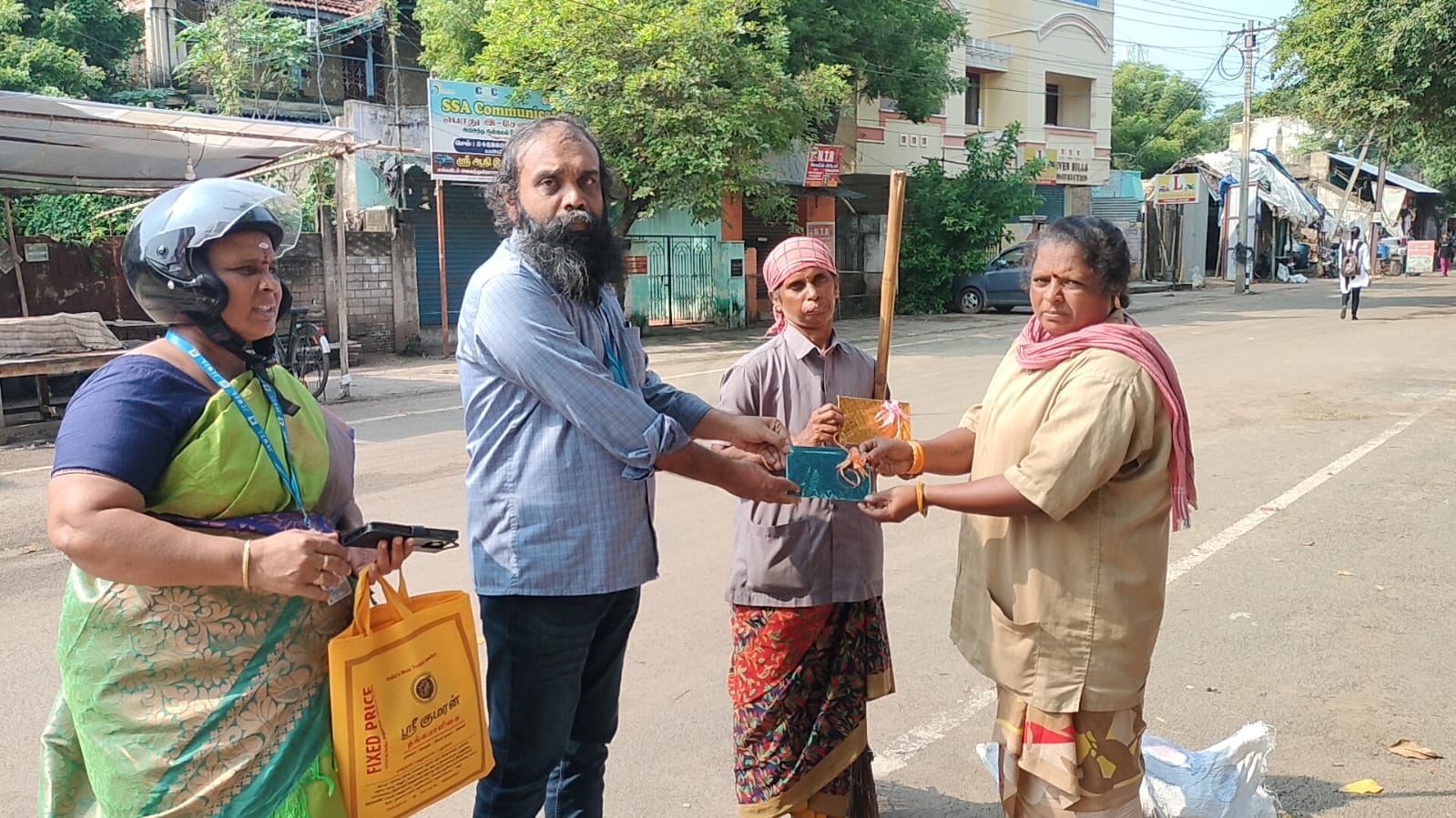தஞ்சை மாநகராட்சியில் ஒப்பந்த அடிப்படையில் பணியாற்றி வரும் தூய்மை பணியாளர்களை கெளரவப் படுத்த வேண்டும் என்ற நோக்கத்திலும் ஏழ்மையில் வாழும் அவர்கள் தீபாவளி தினத்தன்று புத்தாடை உடுத்த வேண்டும் அதற்கு நம்மால் இயன்ற உதவி செய்ய வேண்டும் என்று எண்ணிய சமூக ஆர்வலர் ஜோதி அறக்கட்டளை செயலாளர் பிரபுராஜ்குமார் காலையில் தனது இருசக்கர வாகனத்தில் புறப்பட்டு தூய்மை பணியில் ஈடுபட்டு இருந்தவர்களை நேரில் சந்தித்து அழகாக வடிவமைக்கப்பட்ட ஒரு சிறிய கிப்ட் பாக்ஸை கொடுத்து பிரித்து பார்க்க சொன்னார்.