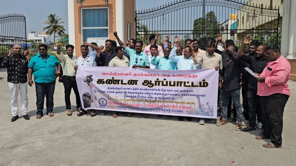 திருப்பத்தூர் மாவட்ட ஆட்சியர் அலுவலகம் முன்பு 50க்கும் மேற்பட்ட திருப்பத்தூர் மாவட்ட பத்திரிக்கையாளர்கள் கண்டன கோஷங்கள் எழுப்பி கண்டன ஆர்பாட்டத்தில் ஈடுப்பட்டனர். இதனால் அப்பகுதியில் பெரும் பரபரப்பு காணப்பட்டது.