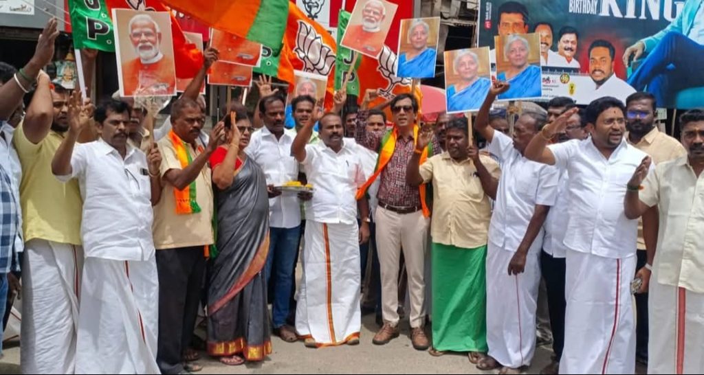 தேனி மாவட்டம் தேனி நகரில் மத்திய அரசு அறிவித்துள்ள GST வரி குறைப்பு செய்த பாரத பிரதமர் நரேந்திர மோடி நிதி அமைச்சர் நிர்மலா சீதாராமன் நன்றி தெரிவிக்கும் விதமாக பாஜக தேனி மாவட்ட தலைவர் பிராஜபாண்டி யன் தலைமையில் மாநில அரசு தொடர்பு பிரிவு தலைவர் சூரிய நாராயணன் முன்னிலையில் தேனி பெரியகுளம் சாலையில் ஜிஎஸ்டி வரிகுறைப்பை வரவேற்று கோஷங்கள் எழுப்பியும் பொது மக்களுக்கு இனிப்புகள் வழங்கியும் இதனை நடைமுறைக்கு கொண்டு வந்த பாரத பிரதமர் நரேந்திர மோடி நிதித்துறை அமைச்சர் நிர்மலா சீதாராமன் ஆகியோரை வாழ்த்தி கோஷங்கள் எழுப்பியும் வெகு சிறப்பாக கொண்டாடப்பட்டது.