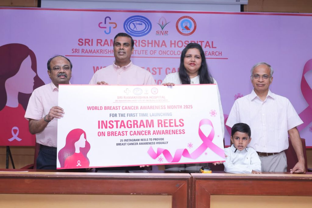 உலகம் முழுவதும் அக்டோபர் மாதம், மார்பக புற்றுநோய் விழிப்புணர்வு மாதமாக கடைபிடிக்கப்பட்டு வருகின்றது. இந்த மாதத்தில் மார்பகப் புற்றுநோய் பற்றிய விழிப்புணர்வை பொதுமக்கள் மத்தியில் ஏற்படுத்தும் வகையிலும், புற்று நோயால் பாதிக்கப்பட்ட நோயாளிகளுக்கு தன்னம்பிக்கை அளிக்கும், மாதமாகவும் கருதப்பட்டு வருகின்றது. இந்த நிலையில் கோவை ஆவாரம்பாளையம் பகுதியில் உள்ள ஸ்ரீ ராமகிருஷ்ணா மருத்துவமனை, புற்றுநோய் சிகிச்சை மற்றும் ஆராய்ச்சி மையம் சார்பாக மார்பக புற்றுநோய் விழிப்புணர்வு தகவல்கள் அடங்கிய இன்ஸ்டாகிராம் வீடியோ தொகுப்புகள் வெளியீட்டு விழா நிகழ்ச்சி மருத்துவமனை வளாகத்தில் நடைபெற்றது. தொடர்ச்சியாக, 23 வது பதிப்பாக நடைபெறும் இந்த விழிப்புணர்வு வீடியோ தமிழ் மற்றும் ஆங்கில மொழி களில் வெளியிட பட்டது