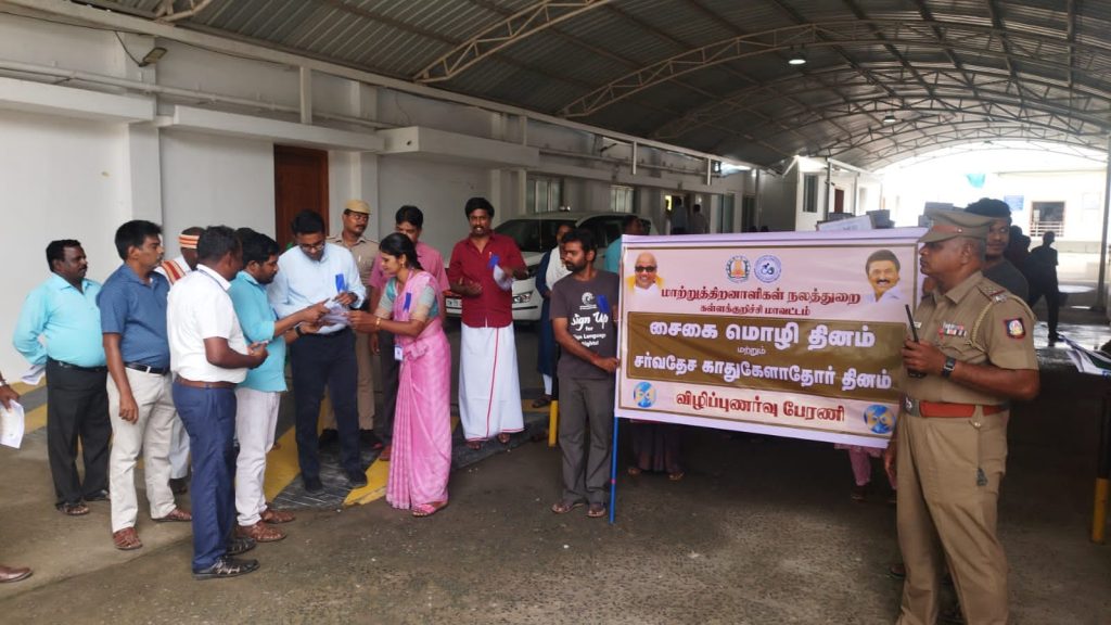 கள்ளக்குறிச்சி மாவட்ட ஆட்சியர் அலுவலக வளாகத்தில் மாற்றுத்திறனாளிகள் நலத்துறை சார்பில் சைகை மொழி தினம் மற்றும் சர்வதேச காது கேளாதோர் தினத்தையொட்டி இதுகுறித்து விழிப்புணர்வு பேரணியை கள்ளக்குறிச்சி மாவட்ட ஆட்சியர்