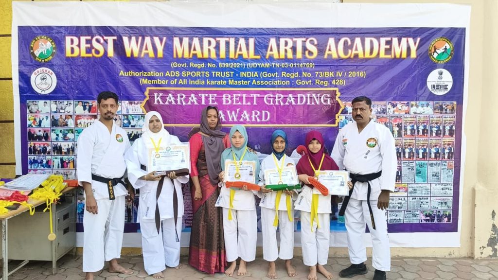 கோவையில் கடந்த 25 ஆண்டுகளாக சிலம்பம், கராத்தே போன்ற பல்வேறு பயிற்சிகளை பெஸ்ட் வே மார்ஷியல் ஆர்ட்ஸ் அகாடமி அளித்து வருகிறது. இதன் தலைமை ஆசானாக சிஹான் ஜெமிஷா இருந்து மாணவ மாணவிகளுக்கு பயிற்சி அளித்து வருகிறார். இது வரையிலும் சுமார் 2000 த்திற்கும் மேற்பட்ட மாணவ மாணவியர்களுக்கு கராத்தே பயிற்சி அளித்து உள்ள நிலையில், இவரிடம் கராத்தே பயிற்சி பெற்ற பலரும் தற்போது கராத்தே ஆசிரியர்களாகவும் இருந்து வருகின்றனர். இந்த நிலையில் மாணவ மாணவியர்களுக்கு சுமார் 6மாத காலம் பயிற்சி அளிக்க பட்டு பின்னர் அவர்களுக்கு போட்டிகள் நடத்த படும். அதில் சிறப்பாக செயல்படும் மாணவ மாணவிகளுக்கு கராத்தே பயிற்சியில் அடுத்த கட்ட நிலை என்றழைக்கப்படும் பெல்ட்கள், சான்றிதழ்கள், அதற்கான மெடல்கள் வழங்கப்படுவது வழக்கம். இந்த நிலையில் இப்பயிற்சி மையத்தில் தற்போது கராத்தே பயிற்சி பெற்று வரும் சுமார் 120 மாணவ மாணவர்களுக்கு இன்று உக்கடம் பகுதியில் உள்ள தீர்க்கத்துல் இஸ்லாமிய பள்ளி வளாகத்தில் பெல்ட் கிரேடிங் டெஸ்ட் நிகழ்ச்சி நடைபெற்றது. இதில் சிறப்பாக விளையாடி அடுத்த கட்ட நிலைக்கு சென்ற அனைவருக்கும் அதற்கான சான்றிதழ்கள், மெடல்கள் வழங்க பட்டது. இந்த நிகழ்ச்சிக்கு தீர்க்கத்துல் இஸ்லாமிய பள்ளியின் தாளாளர் அபுல் ஹீதா தலைமை தாங்கினார். பள்ளியின் தலைமை ஆசிரியர் பக்கீரம்மாள் முன்னிலை வகித்தார். பள்ளியின் துணை தலைமை ஆசிரியர் ரிஜ்வானா வரவேற்ப்புரையாற்றினார். தொடர்ந்து செய்தியாளர்களை சந்தித்து பேசிய கராத்தே பயிற்சியாளர் சிஹான் ஜெமிஷா கூறியதாவது..