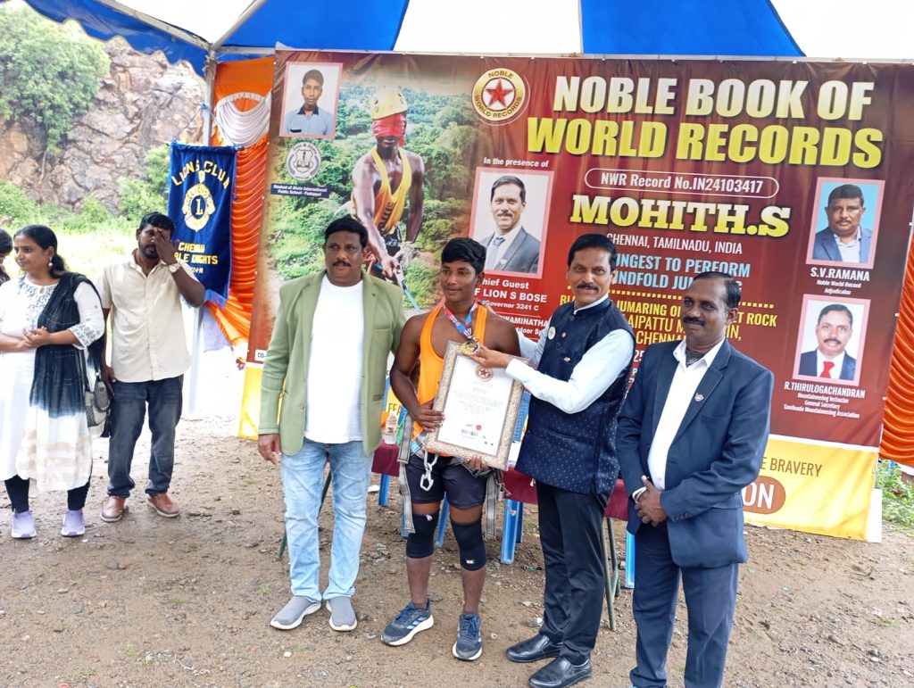 தாம்பரம் அடுத்த மலைப்பட்டு பகுதியில் கண்களை கட்டிக்கொண்டு 155 அடி உயரம் உள்ள மலையில் ஏறி உலக சாதனை புரிந்தார், இதனை நோபல் புக் ஆப் ரெக்கார்ட்ஸ் சாதனை புத்தக நிறுவனத்தினர் அங்கிகாரம் செய்து “பிளைண்ட்ஃபோல்ட் ஜுமரிங் செய்யும் மிகவும் இளையவர்” என பதிவு செய்து அதற்கான சன்றிதழ் பதக்கதை வழங்கியது என்ன பதக்கத்தையும் சான்றிதழையும் லைன்ஸ் கிளப் டிஸ்ட்ரிக்ட் கவர்னர் போஸ் வழங்கினார்.