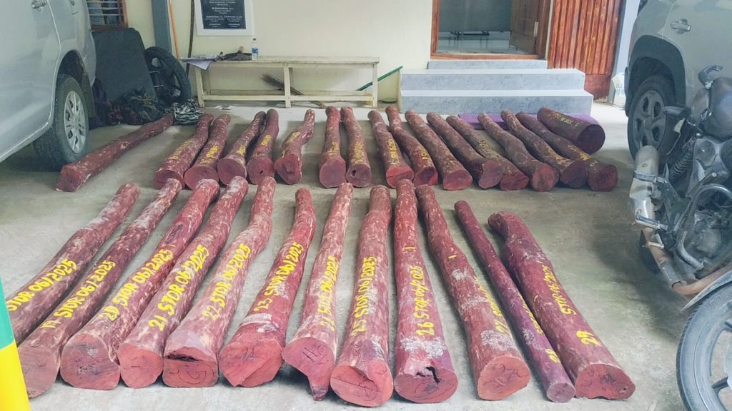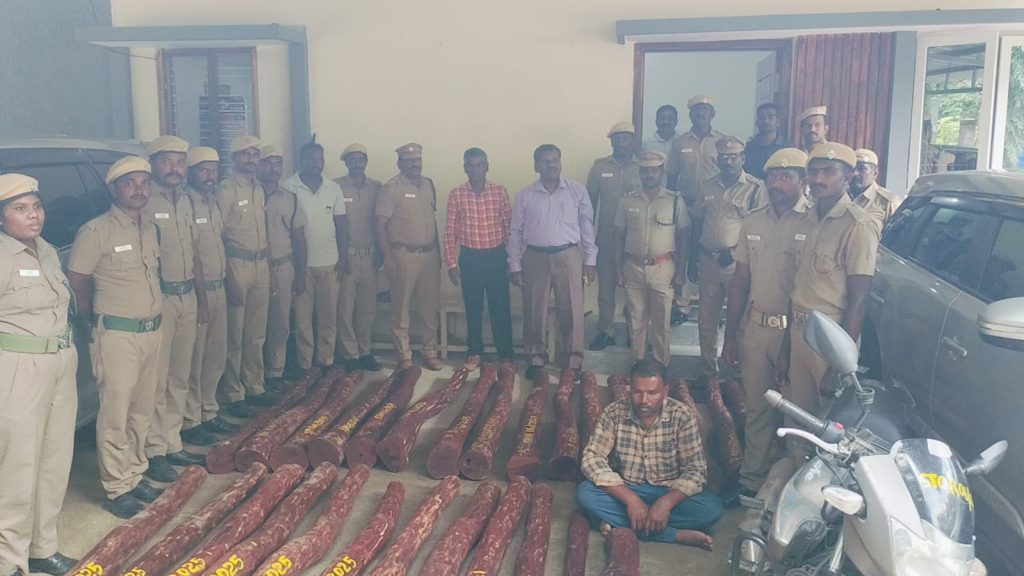 திருப்பத்தூர் மாவட்டம் திருப்பத்தூர் அடுத்த கொடுமாம்பள்ளி பகுதியை சேர்ந்த அழகு மணிமகன் சேகர் (35) இவர் காக்கனா பாளையம் பகுதியில் உள்ள தன்னுடைய பம்பு செட்டில் 820 kg அடங்கிய 50 லட்சம் மதிப்பிலான செம்மரக்கட்டைகளை பதுக்கி வைத்து பெங்களூருக்கு கடத்த இருந்தார்.