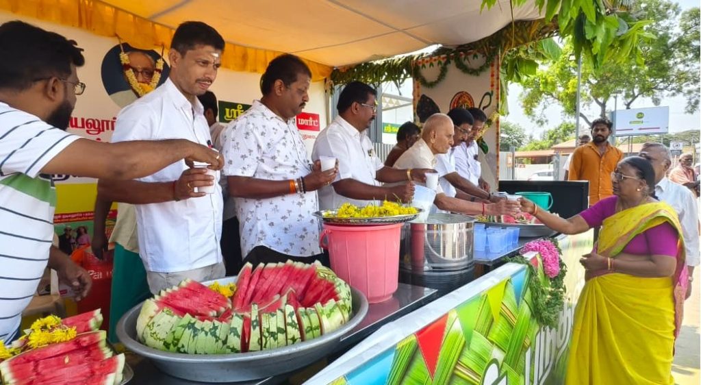சிறப்பு பூஜை செய்து தொடங்கப்பட்ட நீர் மோர் பந்தலில் பொதுமக்களுக்கு நீர் மோர் மற்றும் தர்பூசணி வழங்கினர். அதனை அவ்வழியாக சென்ற வாகன ஓட்டிகள் மற்றும் பொதுமக்கள் ஆர்வமுடன் வந்து வாங்கி பருகிச் சென்றனர். தினமும் சுமார் 1000 லிட்டர் நீர் மோர் பொதுமக்களுக்கு வழங்குகின்றனர்.