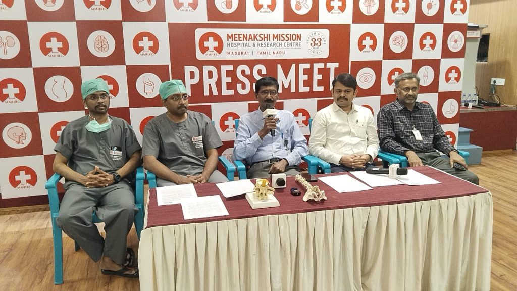 தென் தமிழகத்தின் முதன்மை மருத்துவமனையாக புகழ் பெற்ற மீனாட்சி மிஷன் மருத்துவமனை மற்றும் ஆராய்ச்சி மையமருத்துவர்கள், 60 வயது மூதாட்டியின் கீழ் முதுகில் கடுமையான வலியை ஏற்படுத்தி வந்த சூடோமெனிங்கோசெல் என அழைக்கப்படும் ஒரு பெரிய கட்டியை வெற்றிகரமாக அகற்றியுள்ளனர். மூளை மற்றும் தண்டுவடத்தைப் பாதுகாக்கும் நிறமற்ற ‘செரிப்ரோஸ்பைனல் திரவம்’ (CSF) நிரம்பிய இந்த அசாதாரணமான கட்டி ஐந்து ஆண்டுகளுக்கு முன்பு வேறு மருத்துவமனையில் செய்யப்பட்ட தண்டுவட அறுவைசிகிச்சையின் (L5-51 discectomy) பக்கவிளைவாக உருவாகியிருக்கலாம் என்று என மருத்துவர்கள் தெரிவித்தனர்.