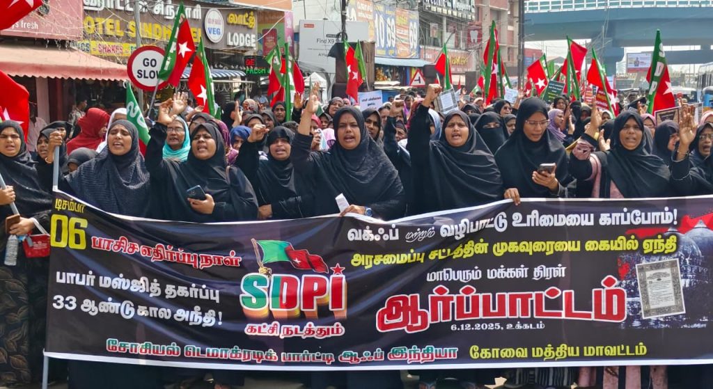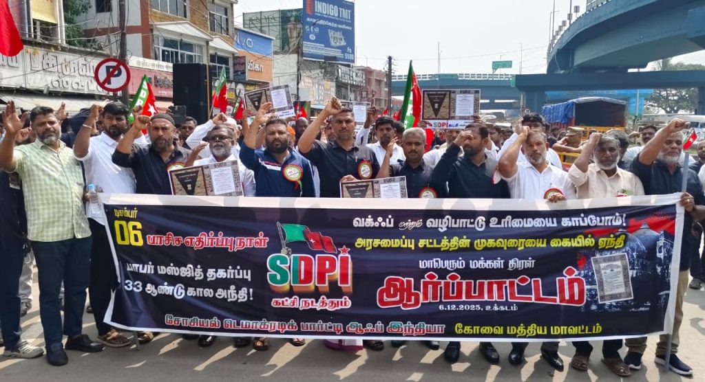 பாபரி மஸ்ஜித் இடிப்பு தினமான டிச.06ம் தேதியை முன்னிட்டு, வக்ஃப் மற்றும் வழிபாட்டு உரிமையை காப்போம் என்கிற முழக்கத்துடன் தமிழகம் உள்பட நாடு முழுவதும் எஸ்டிபிஐ கட்சி சார்பாக பெருந்திரள் ஆர்ப்பாட்டங்கள் நடைபெற்றது.